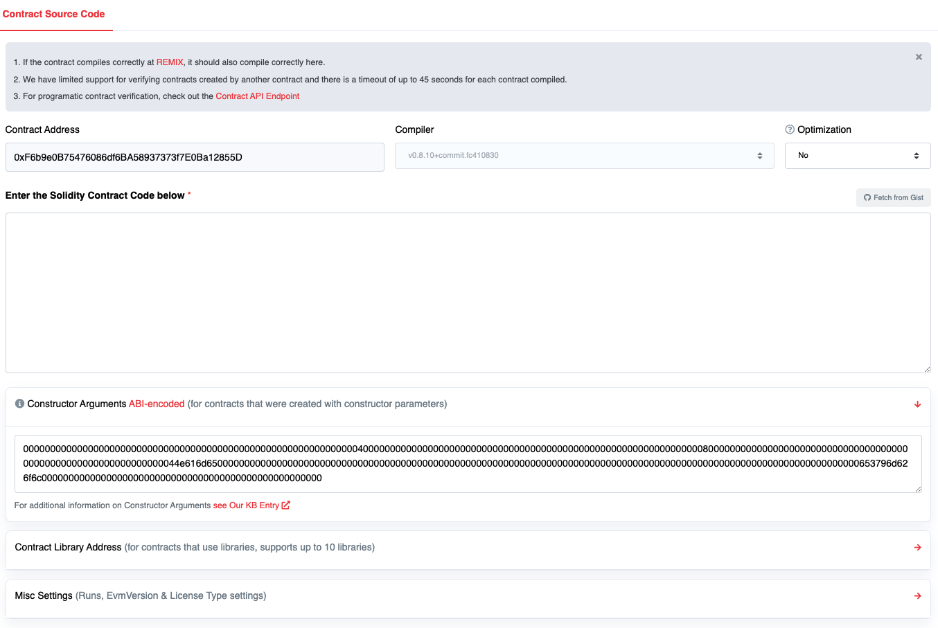 }If you receive errors about constructor arguments, they can be provided in ABI hex encoded form on the contract verification page.